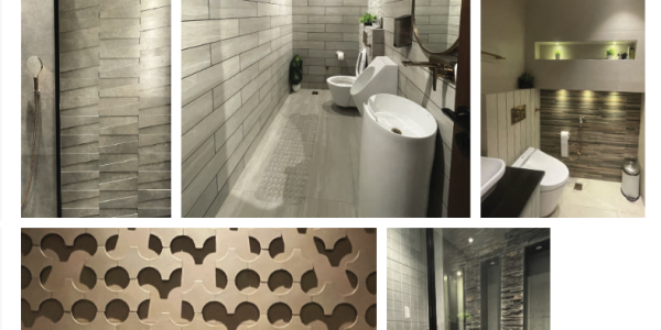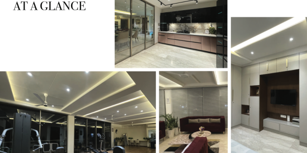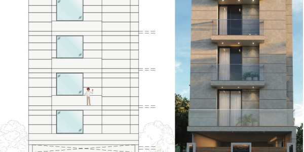The front facade design emphasizes the play of horizontal and vertical planes. The grey muted tile finish blended with symmetrical proportions of the building reflects a subdued yet contemporary architectural approach.