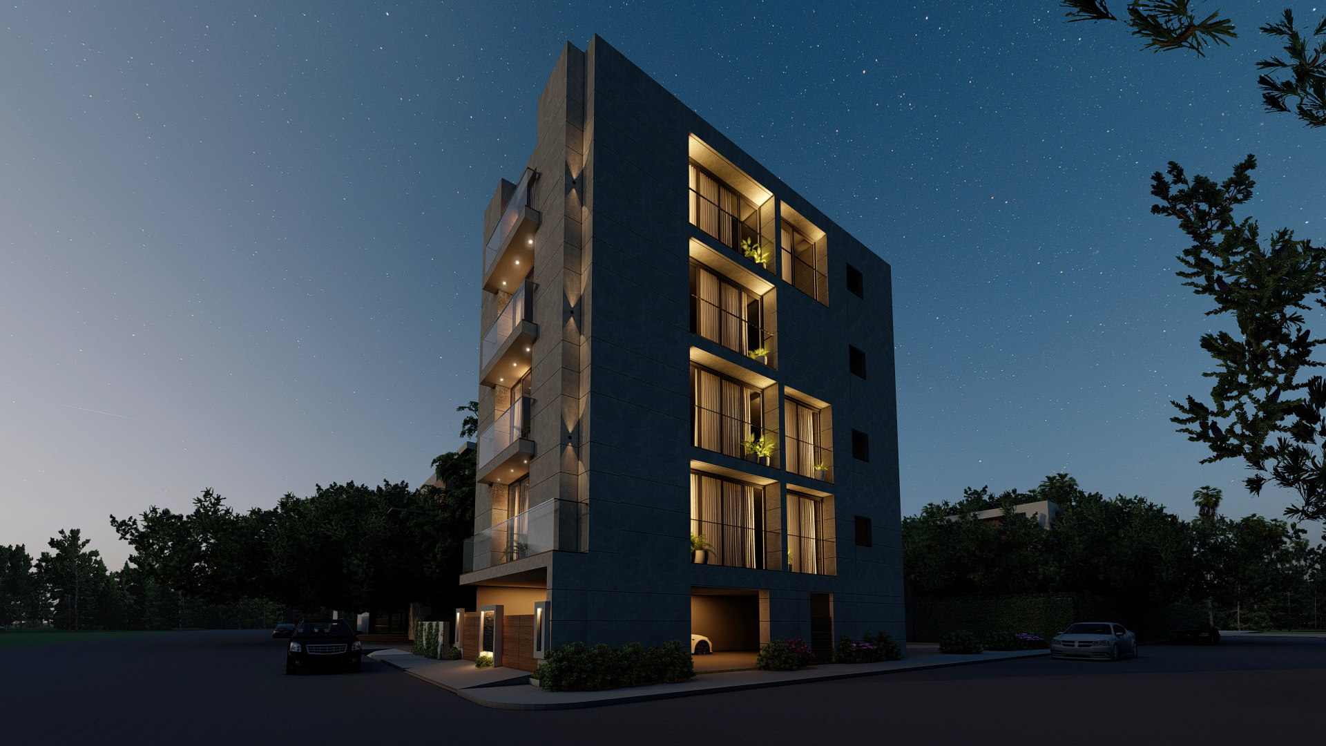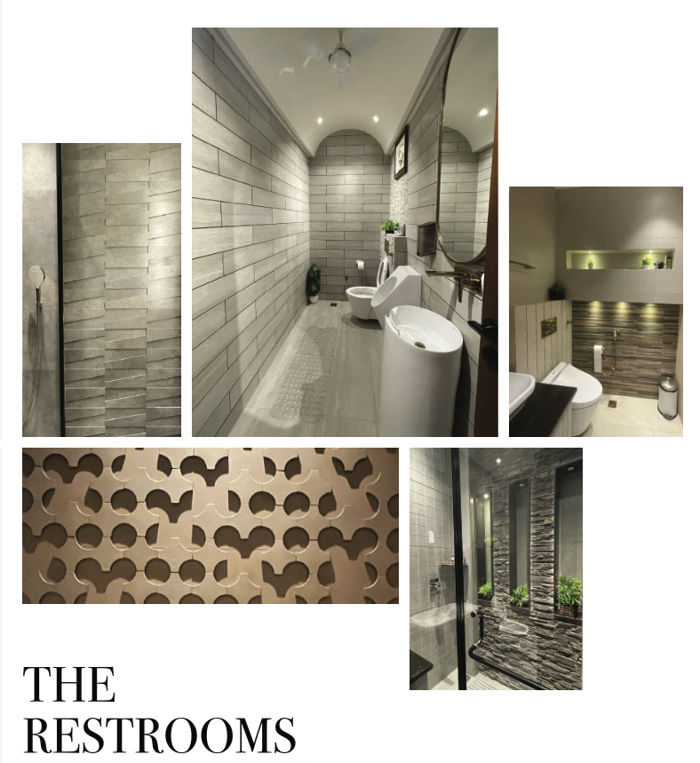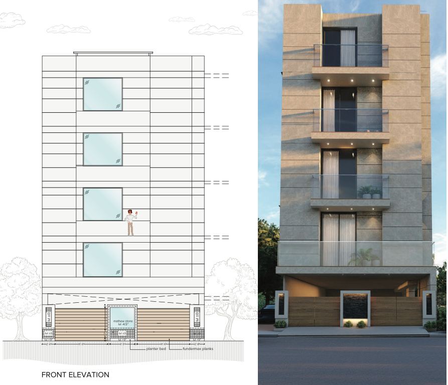 The front facade design emphasizes the play of horizontal and vertical planes. The grey muted tile finish blended with symmetrical proportions of the building reflects a subdued yet contemporary architectural approach.
