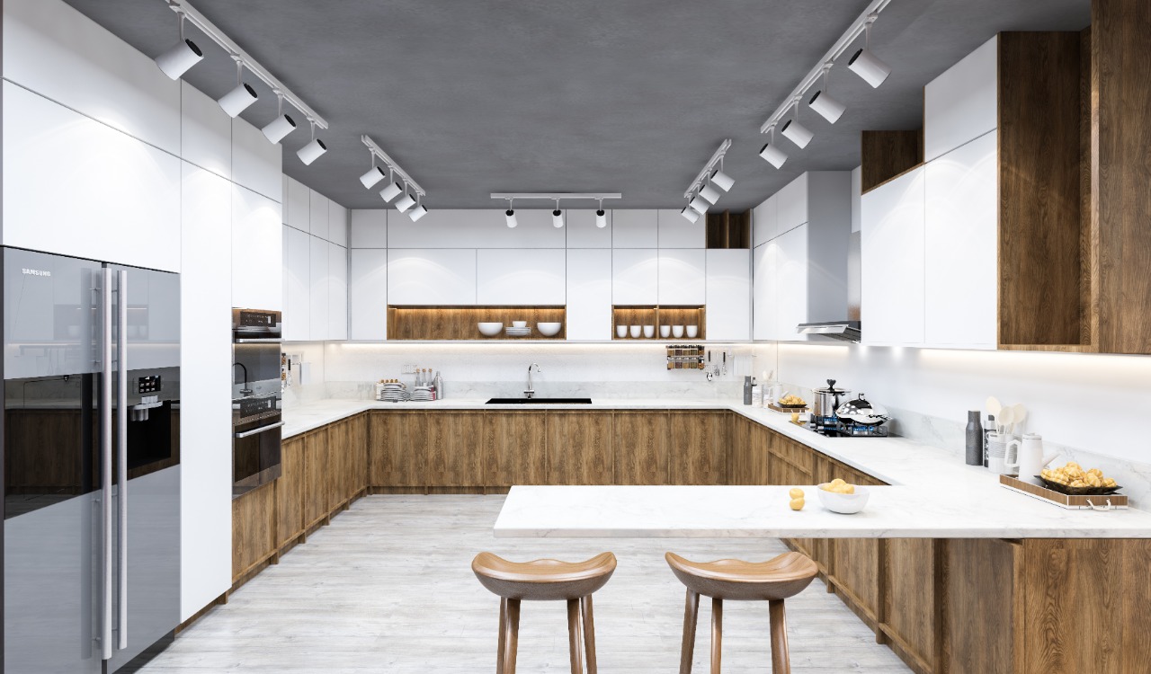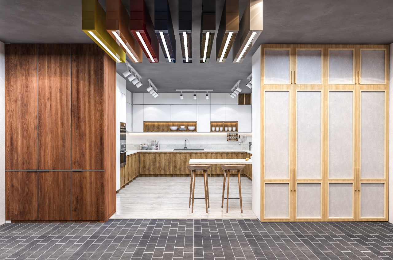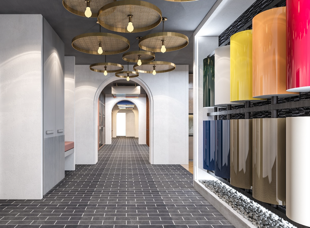 The need was to create a unique display of modular Kitchens and Cupboards showcasing varied styles and sizes. The architects/end consumers who walked had to be given a sense of exclusivity and variety across categories. The space was conceptualised as a European street with an arcade walkway facilitating movement in and out of different display zones.